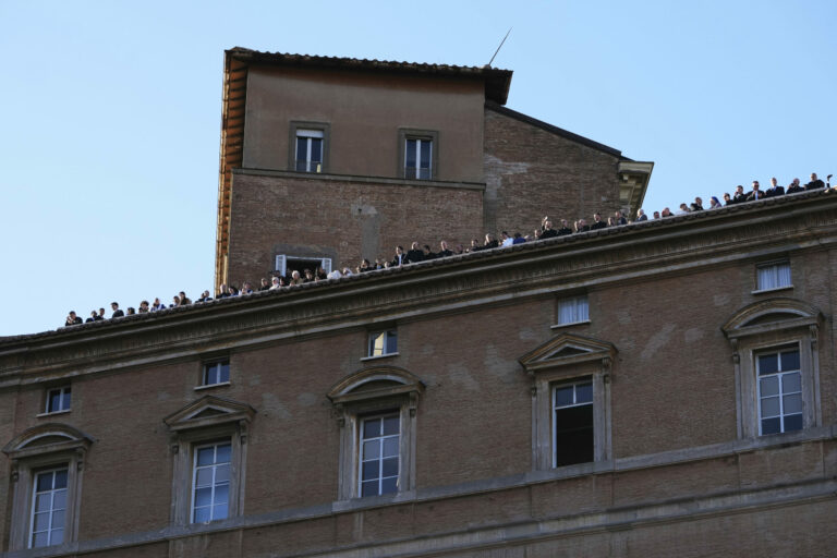 Duchovenstvo a veriaci stoja na strešnom balkóne po tom, čo sa z komína Sixtínskej kaplnky, kde sa vo štvrtok 8. mája 2025 vo Vatikáne zhromaždilo 133 kardinálov, aby zvolili nástupcu zosnulého pápeža Františka, valil biely dym. Foto: SITA/AP
