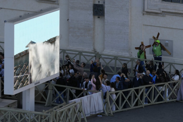 Ľudia sledujú biely dym valiaci sa z komína Sixtínskej kaplnky, kde sa vo Vatikáne vo štvrtok 8. mája 2025 zhromaždilo 133 kardinálov, aby zvolili nástupcu zosnulého pápeža Františka. Foto: SITA/AP