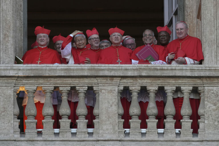 Kardináli po zvolení kardinála Roberta F. Prevosta za 267. pápeža, pričom si vybrali meno pápež Lev XIV. Foto: SITA/AP