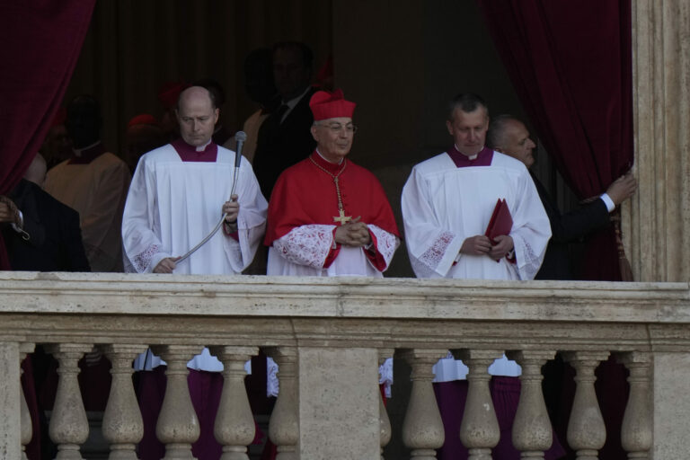 Kardinál protodiakon Dominique Mamberti oznamuje z centrálnej lodžie Baziliky svätého Petra vo Vatikáne zvolenie kardinála Roberta Prevosta za 267. pápeža Rímskokatolíckej cirkvi. Foto: SITA/AP