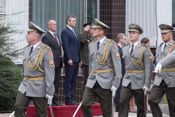 Zľava: Minister obrany SR Peter Gajdoš, náčelník Generálneho štábu Ozbrojených síl Daniel Zmeko a predseda vlády SR Peter Pellegrini počas privítania premiéra s poctami pri príležitosti kontrolného dňa na Ministerstve obrany SR. Bratislava, 14. september 2018. Foto: SITA/Braňo Bibel.