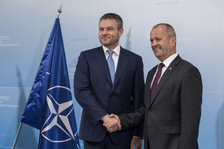Sprava: Minister obrany SR Peter Gajdoš počas privítania predsedu vlády SR Petra Pellegriniho počas kontrolného dňa predsedu vlády na Ministerstve obrany SR. Bratislava, 14. september 2018. Foto: SITA/Braňo Bibel.