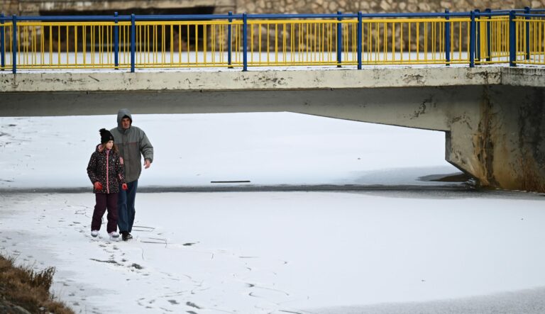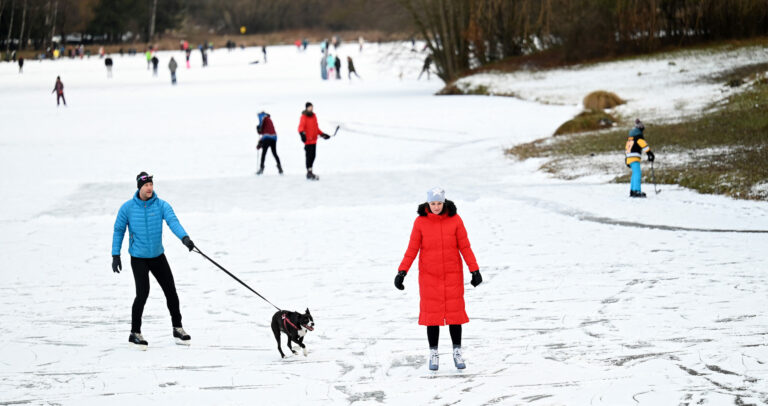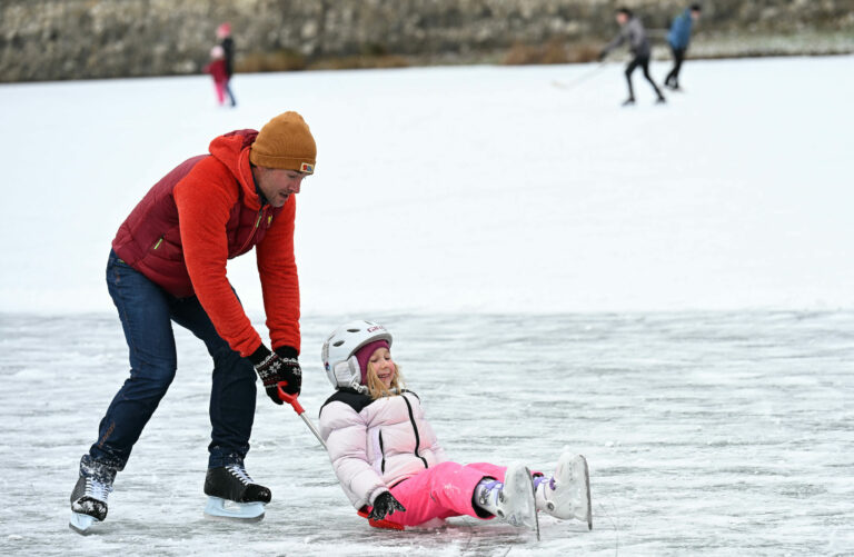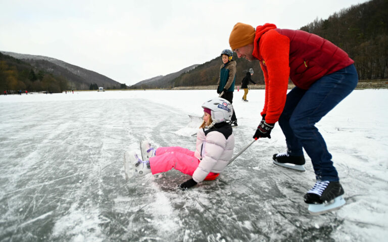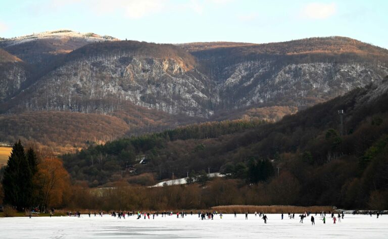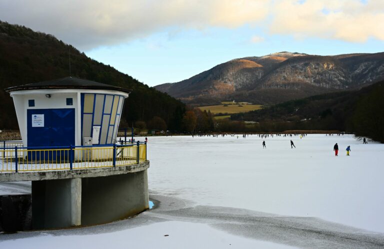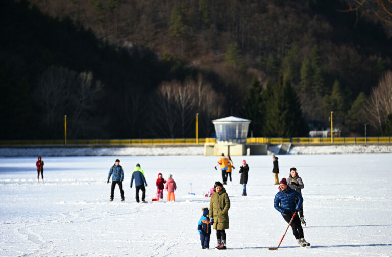 Ľudia sa korčulujú na prírodnom ľade na vodnej nádrži Baračka neďaleko Trenčianskych Teplíc. Vďaka výdatným mrazom sa ľad vytvoril na jazerách, rybníkoch a iných prírodných vodných plochách. Trenčianske Teplice, 4. január 2025. 6. január v kresťanskej tradícii: Poklona mudrcov a zjavenie Mesiáša. Foto: SITA/Tomáš Somr