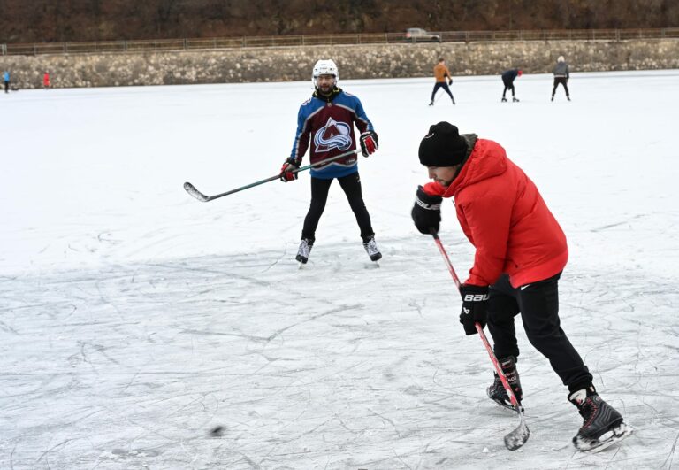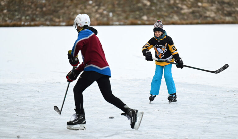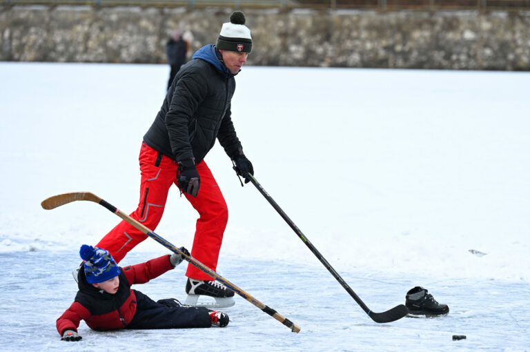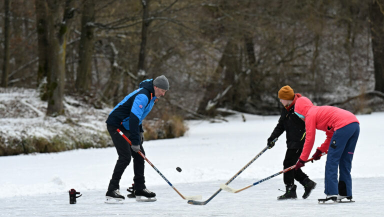 Ľudia hrajú hokej na prírodnom ľade na vodnej nádrži Baračka neďaleko Trenčianskych Teplíc. Vďaka výdatným mrazom sa ľad vytvoril na jazerách, rybníkoch a iných prírodných vodných plochách. Trenčianske Teplice, 4. január 2025. Foto: SITA/Tomáš Somr