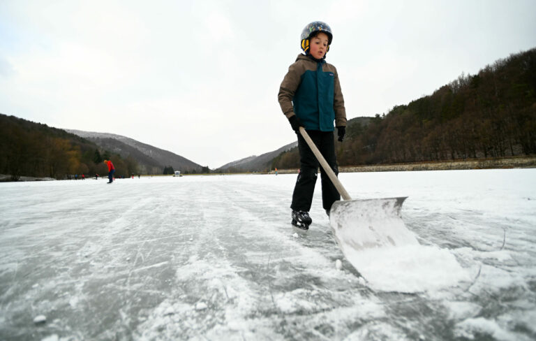 Chlapec odhŕňa sneh na prírodnom ľade na vodnej nádrži Baračka neďaleko Trenčianskych Teplíc. Vďaka výdatným mrazom sa ľad vytvoril na jazerách, rybníkoch a iných prírodných vodných plochách. Trenčianske Teplice, 4. január 2025. Foto: SITA/Tomáš Somr