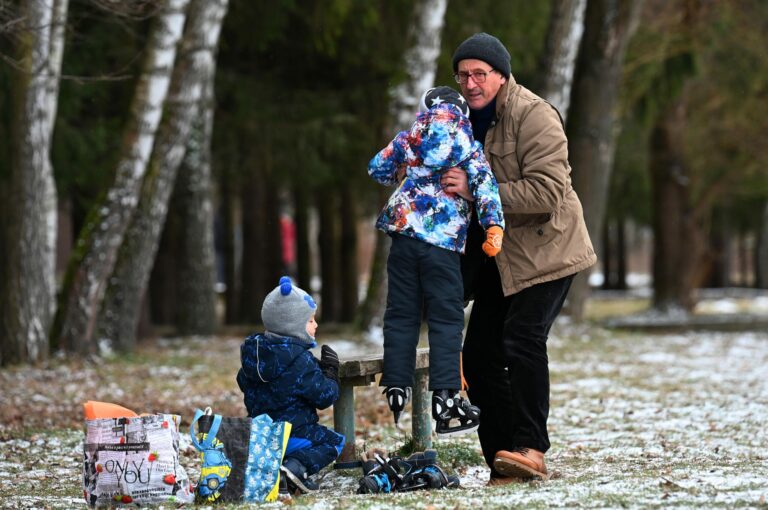 Ľudia oddychujú po korčulovaní na prírodnom ľade na vodnej nádrži Baračka neďaleko Trenčianskych Teplíc. Vďaka výdatným mrazom sa ľad vytvoril na jazerách, rybníkoch a iných prírodných vodných plochách. Trenčianske Teplice, 4. január 2025. Foto: SITA/Tomáš Somr