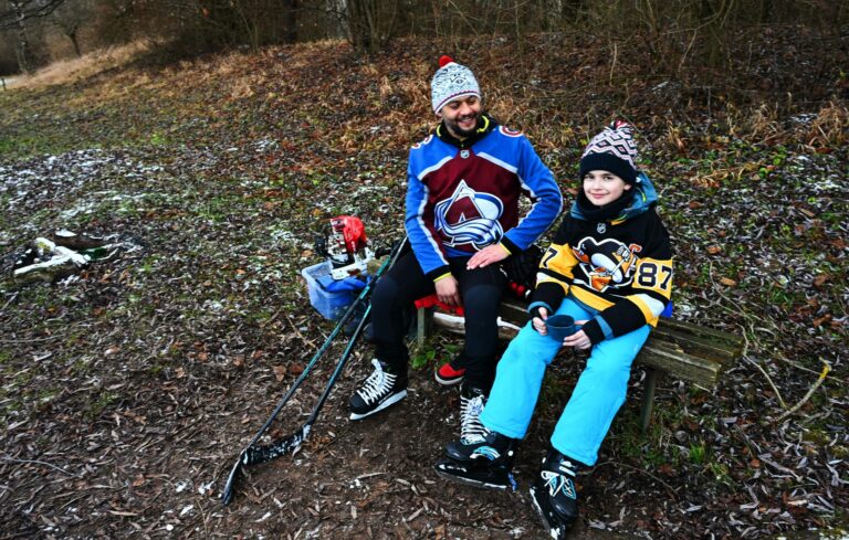 Ľudia sa pripravujú na korčulovanie na prírodnom ľade na vodnej nádrži Baračka neďaleko Trenčianskych Teplíc. Vďaka výdatným mrazom sa ľad vytvoril na jazerách, rybníkoch a iných prírodných vodných plochách. Trenčianske Teplice, 4. január 2025. Foto: SITA/Tomáš Somr