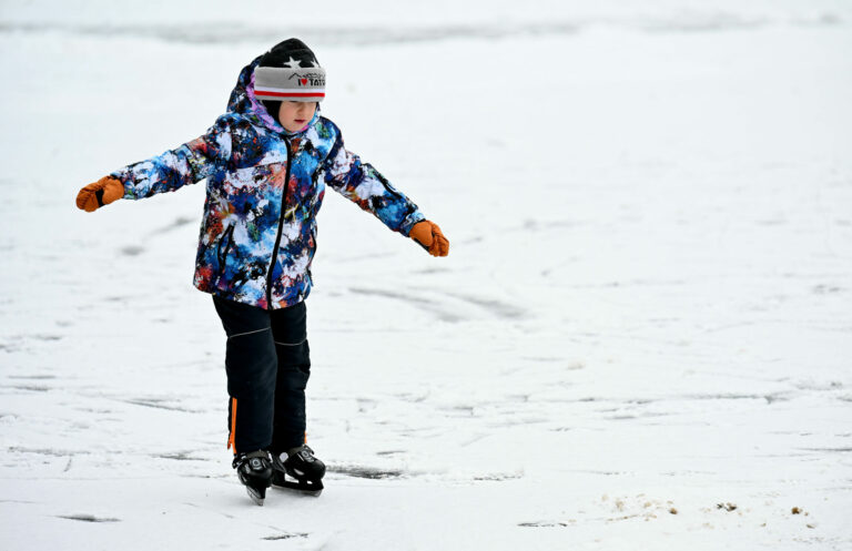 Chlapec sa korčuluje na prírodnom ľade na vodnej nádrži Baračka neďaleko Trenčianskych Teplíc. Vďaka výdatným mrazom sa ľad vytvoril na jazerách, rybníkoch a iných prírodných vodných plochách. Trenčianske Teplice, 4. január 2025. Foto: SITA/Tomáš Somr