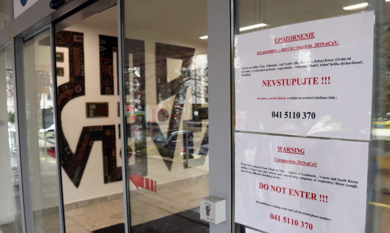 Oznam pri vstupe do budovy Fakultnej nemocnice s poliklinikou ilina o návšteve zdravotníckeho zariadenia v súvislosti s výskytom nového koronavírusu (2019-nCoV) na Slovensku. Bratislava, 11. marec 2020. Foto: SITA/FNsP ZA