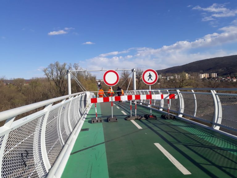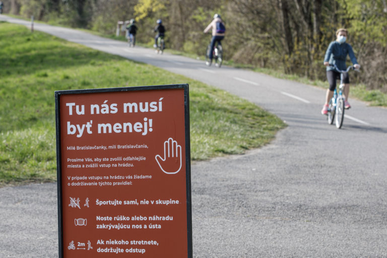 Výzva k dodržiavaniu bezpečného správania sa na petržalskej hrádzi v Bratislave počas mimoriadnej situácie v súvislosti s výskytom ochorenia COVID-19 spôsobeným koronavírusom (2019-nCoV) na Slovensku. Bratislava, 4. marec 2020. Foto: SITA/Branislav Bibel