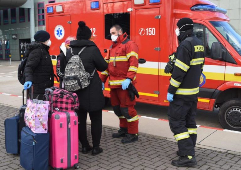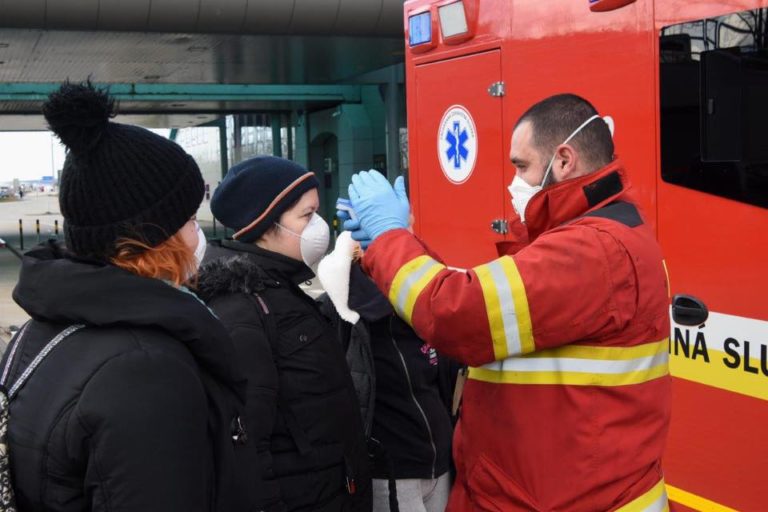 Príslušník Hasičského a záchranného zboru (HaZZ) SR meria teplotu cestujúcemu prechádzajúcemu cez hraničný priechod Jarovce-Kittsee v súvislosti s ochorením COVID-19 spôsobeným koronavírusom (2019-nCoV) na Slovensku. Bratislava, 14. marec 2020. Foto: SITA/Prezídium HaZZ