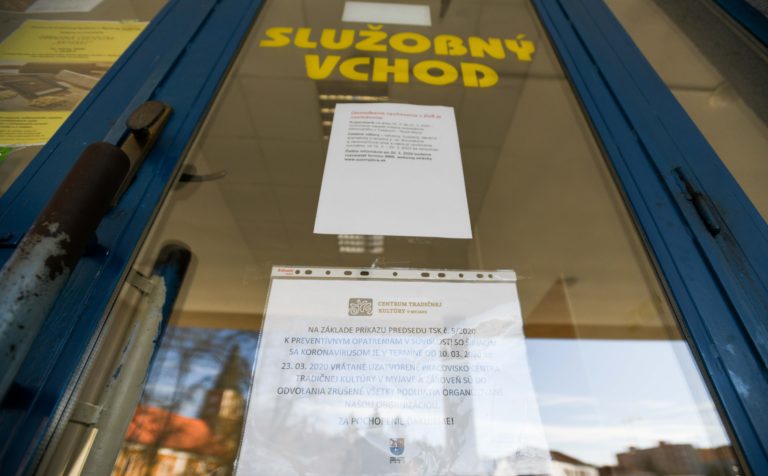 Oznam o dočasnom zatvorení Domu kultúry Samka Dudíka v Myjave v súvislosti s výskytom nového koronavírusu (2019-nCoV) na Slovensku. Stará Turá, 10. marec 2020. Foto: SITA/Martin Medňanský
