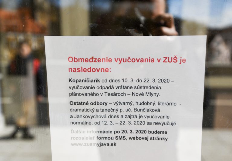 Pohľad na oznam týkajúci sa Základnej umeleckej školy (ZOŠ) v Starej Turej, ktorá v súvislosti s výskytom nového koronavírusu (2019-nCoV) na Slovensku funguje v obmedzenej prevádzke. Stará Turá, 10. marec 2020. Foto: SITA/Martin Medňanský