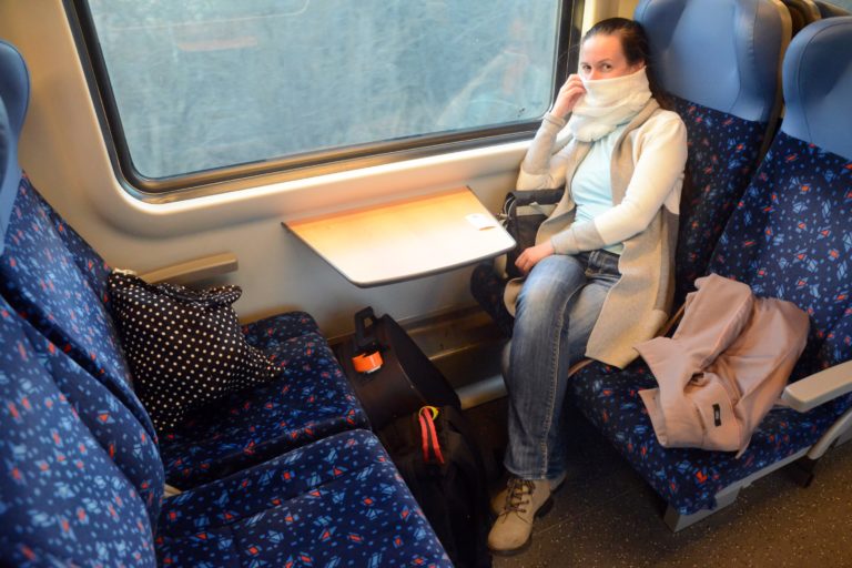 Cestujúca vo vlaku so šatkou na ústach ako opatrenie v súvislosti s výskytom ochorenia COVID-19 spôsobeným koronavírusom (2019-nCoV) na Slovensku, na Hlavnej stanici v Bratislave. Bratislava, 13. marec 2020. Foto: SITA/Jakub Julény