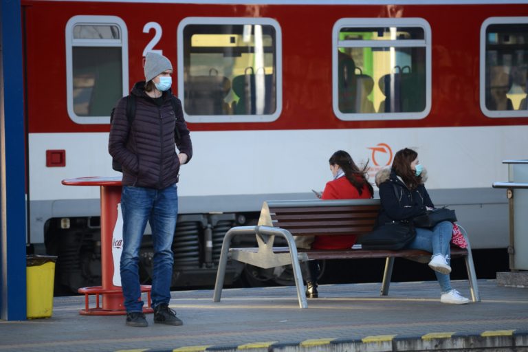 Cestujúci vo vlaku so šálom na ústach ako opatrenie v súvislosti s výskytom ochorenia COVID-19 spôsobeným koronavírusom (2019-nCoV) na Slovensku, na Hlavnej stanici v Bratislave. Bratislava, 13. marec 2020. Foto: SITA/Jakub Julény