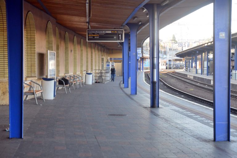 Pohľad na prázdne nástupište Hlavnej stanice v Bratislave v čase mimoriadnej situácie v súvislosti s výskytom ochorenia COVID-19 spôsobeným koronavírusom (2019-nCoV) na Slovensku. Bratislava, 13. marec 2020. Foto: SITA/Jakub Julény
