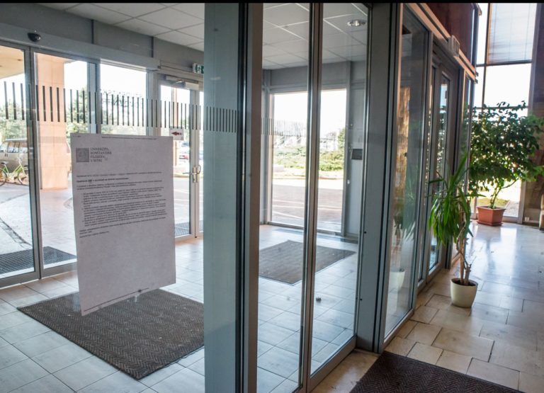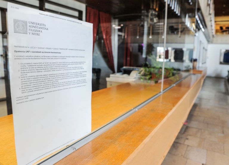 Oznam v priestoroch Univerzity Konštantína Filozofa (UKF) v Nitre, ktorá je v súvislosti s výskytom nového koronavírusu (2019-nCoV) na Slovensku dočasne zatvorená. Nitra, 10. marec 2020. Foto: SITA/Martin Havran