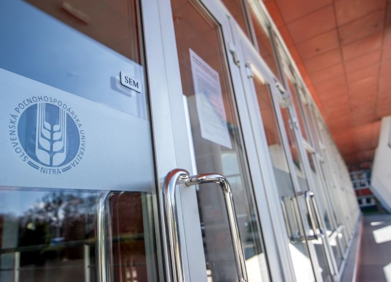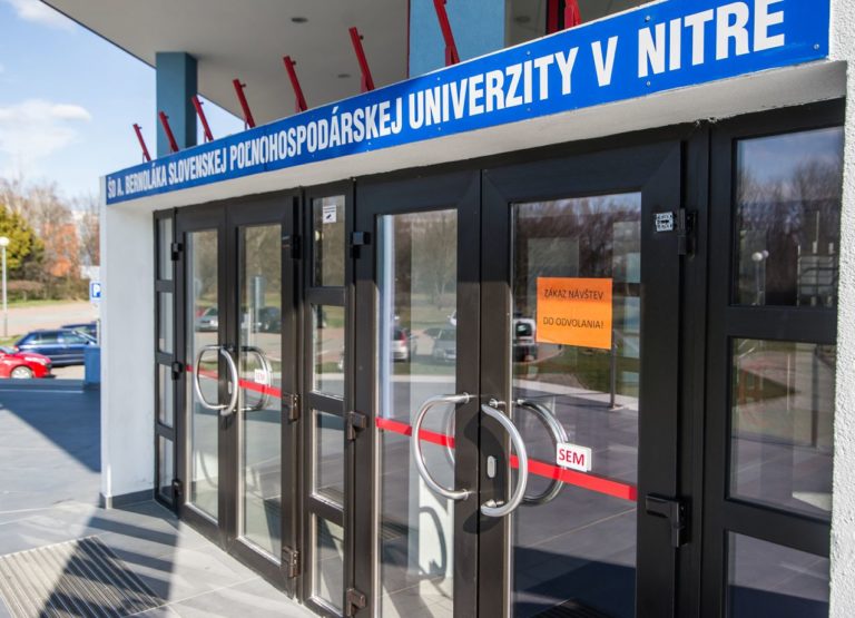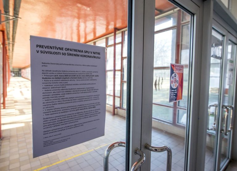 Oznam na dverách Slovenskej poľnohospodárskej univerzity (SPU) v Nitre, ktorá je v súvislosti s výskytom nového koronavírusu (2019-nCoV) na Slovensku dočasne zatvorená. Nitra, 10. marec 2020. Foto: SITA/Martin Havran