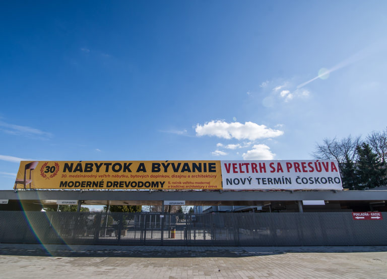 Oznam o zrušení výstavy Nábytok a bývanie na výstavisku Agrokomplex v Nitre v súvislosti s výskytom nového koronavírusu (2019-nCoV) na Slovensku. Nitra, 10. marec 2020. Foto: SITA/Martin Havran