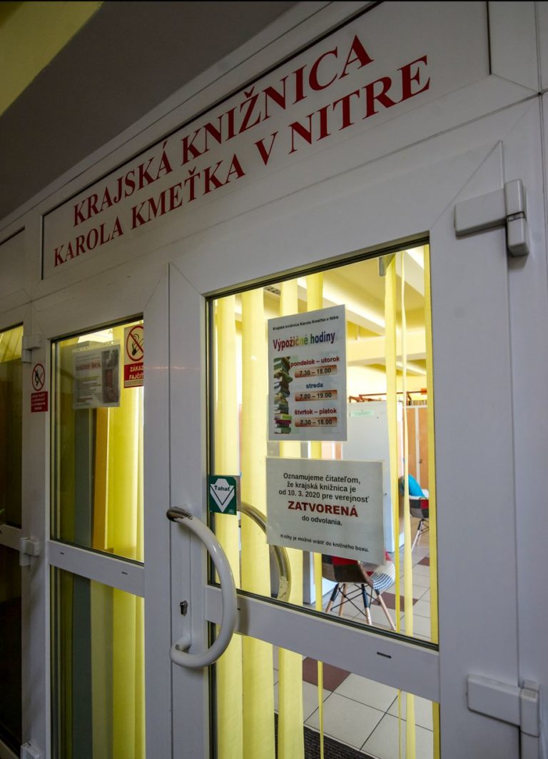 Oznam na dverách Krajskej knižnice v Nitre, ktorá je v súvislosti s výskytom nového koronavírusu (2019-nCoV) na Slovensku dočasne zatvorená. Nitra, 10. marec 2020. Foto: SITA/Martin Havran