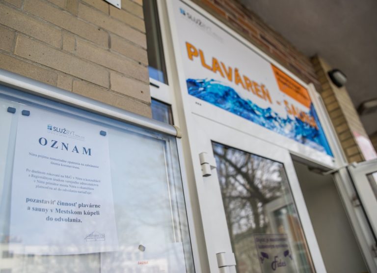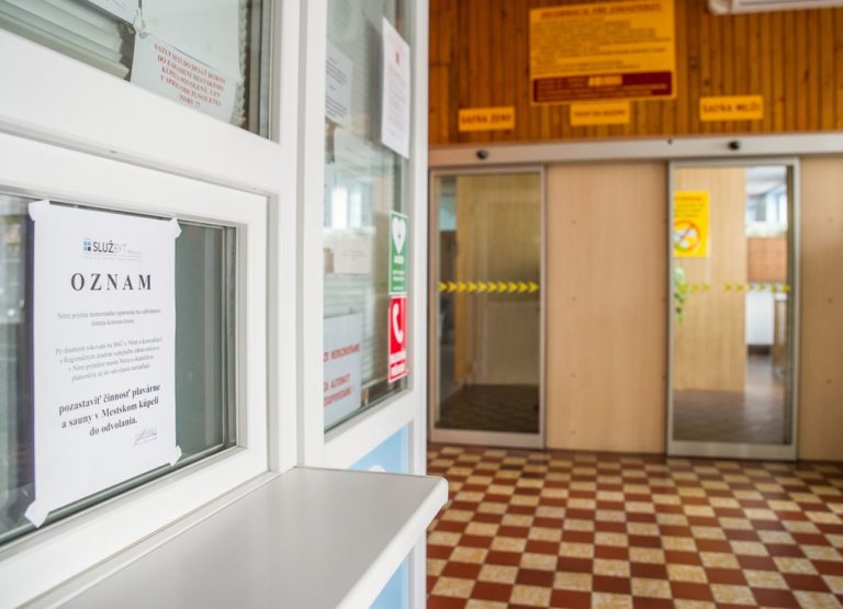 Oznam na dverách plavárne Mestský kúpeľ v Nitre, ktorá je v súvislosti s výskytom nového koronavírusu (2019-nCoV) na Slovensku dočasne zatvorená. Nitra, 10. marec 2020. Foto: SITA/Martin Havran