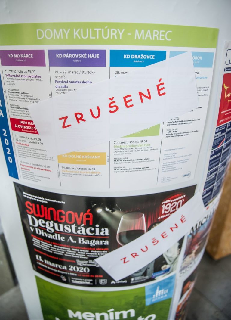 Oznámenie o zrušení kultúrnych akcií v Dome kultúry v Nitre v súvislosti s výskytom nového koronavírusu (2019-nCoV) na Slovensku. Nitra, 10. marec 2020. Foto: SITA/Martin Havran