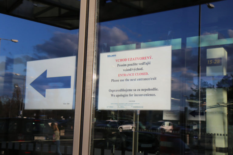 Oznam na dverách letiska Milana Rastislava Štefánika v Bratislave. Uzatvorenie medzinárodných letísk je opatrením v súvislosti s výskytom ochorenia COVID-19 spôsobeným koronavírusom (2019-nCoV) na Slovensku. Bratislava, 13. marec 2020. Foto: SITA/Alexandra Čunderlíková