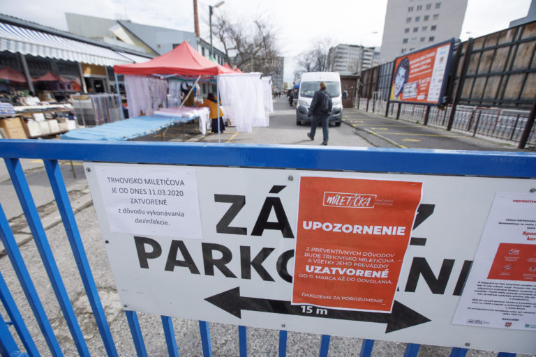 Oznam na bráne informujúci o dočasnom zatvorení trhoviska na Miletičovej ulici v Bratislave počas dezinfekcie v súvislosti s výskytom nového koronavírusu (2019-nCoV) na Slovensku. Bratislava, 11. marec 2020. Foto: SITA/Branislav Bibel