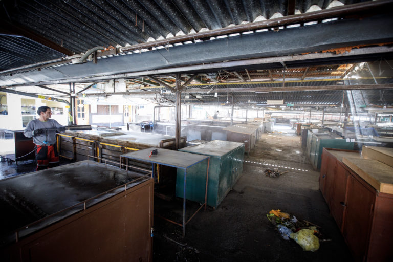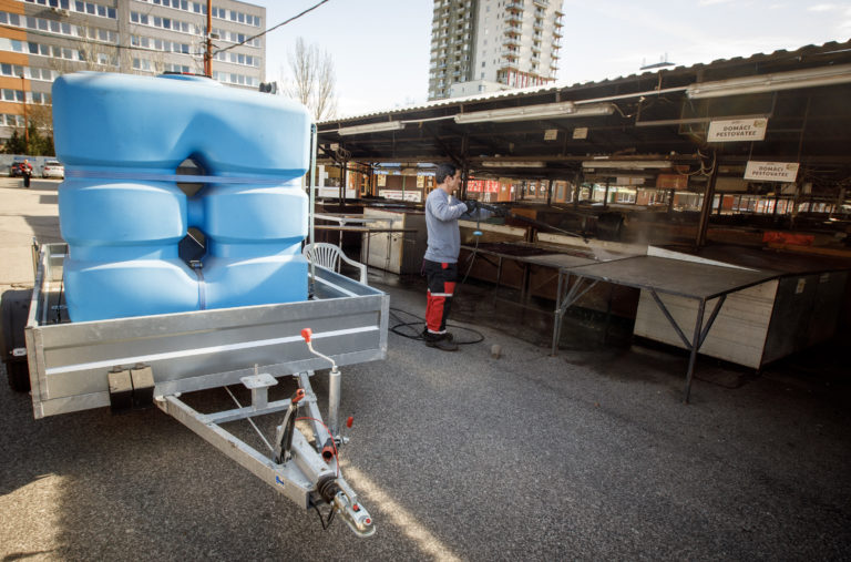Priestory trhoviska Miletičova v Bratislave počas dezinfekcie celého areálu v súvislosti s prevenciou pred ochorením COVID-19 spôsobeným koronavírusom (2019-nCoV). Bratislava, 12. marec 2020. Foto: SITA/Branislav Bibel