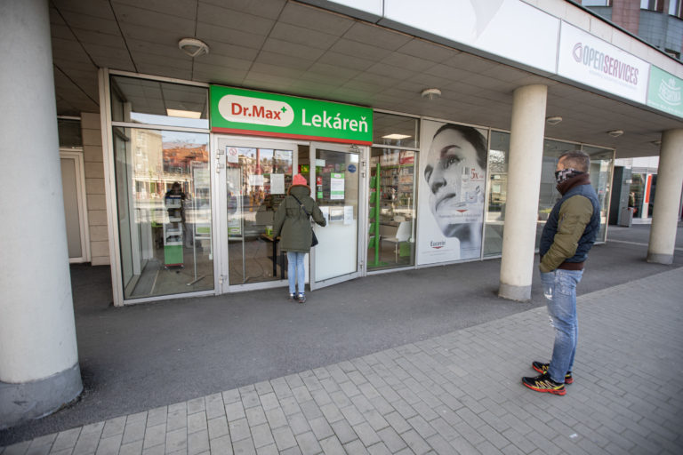 Zákazníci čakajú pred lekárňou z dôvodu požiadavky, aby do lekárne vstupovali po jednom, ako opatrenie v súvislosti s výskytom ochorenia COVID-19 spôsobeným koronavírusom (2019-nCoV) na Slovensku. Bratislava, 16. marec 2019. Foto: SITA/Branislav Bibel