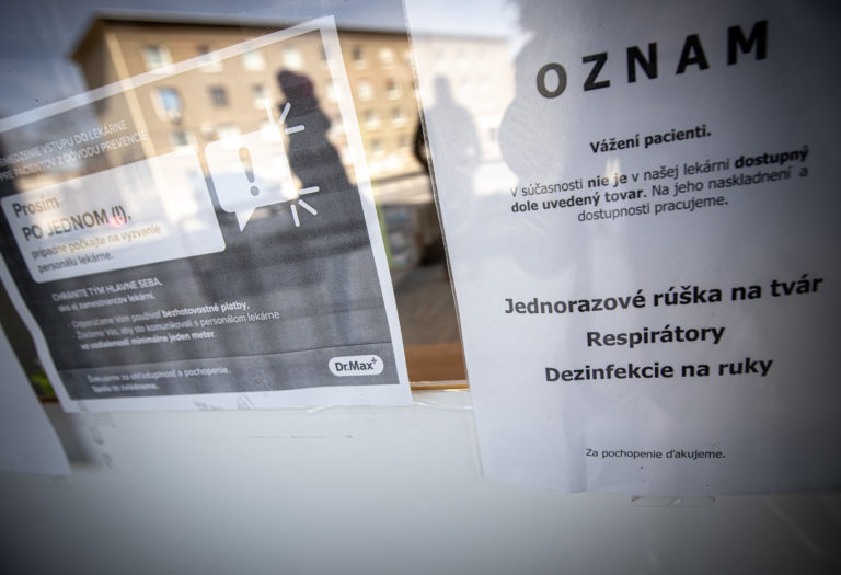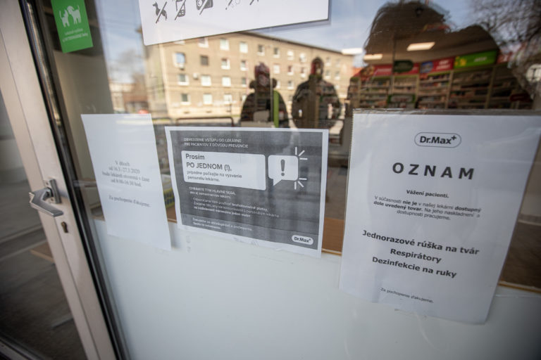 Oznam a požiadavka pre zákazníkov, aby do lekárne vstupovali po jednom, ako opatrenie v súvislosti s výskytom ochorenia COVID-19 spôsobeným koronavírusom (2019-nCoV) na Slovensku. Bratislava, 16. marec 2019. Foto: SITA/Branislav Bibel