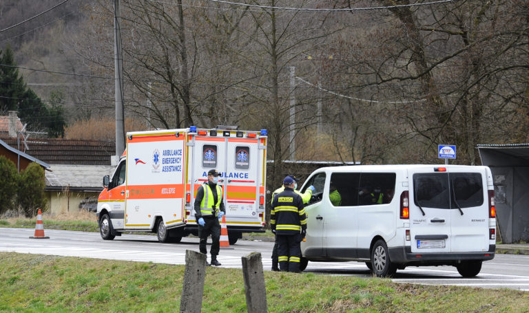 Policajti a hasiči kontrolujú vodiča na hraničnom priechode s Českou republikou Drietoma - Starý Hrozenkov, na ktorom začali od 13. marca 2020 s dočasnou kontrolou motorových vozidiel v súvislosti s ochorením COVID-19 spôsobeným koronavírusom (2019-nCoV) na Slovensku. Drietoma, 13. marec 2020. Foto: SITA/Tomáš Somr