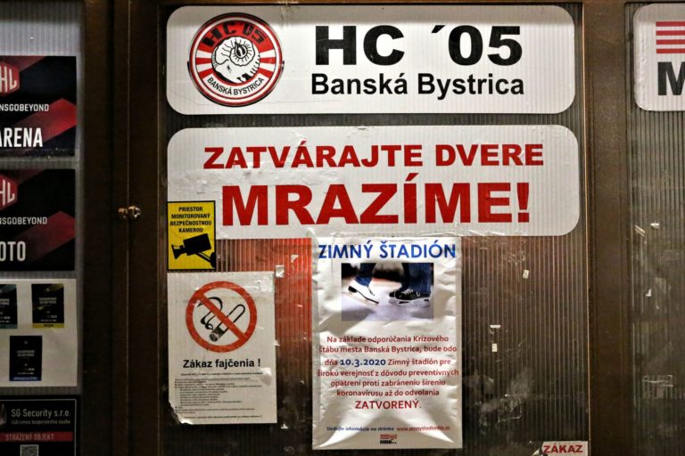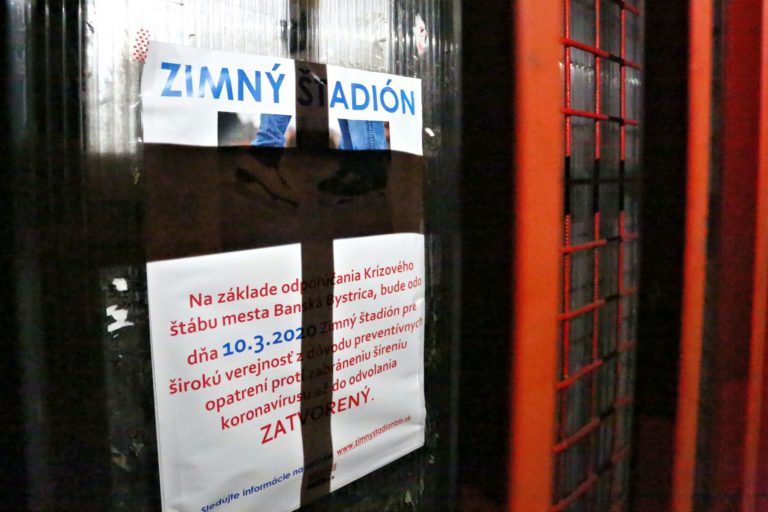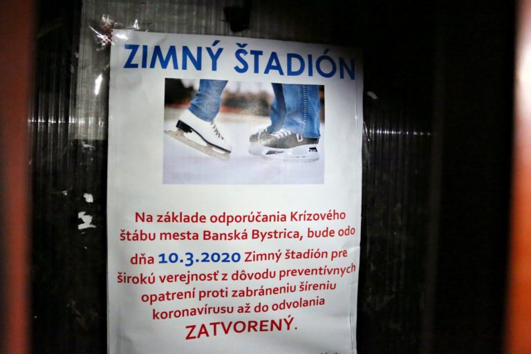 Oznam pri vchode na zimný štadión v Banskej Bystrici informujúci o jeho dočasnom zatvorení v súvislosti s výskytom nového koronavírusu (2019-nCoV) na Slovensku. Banská Bystrica, 10. marec 2020. Foto: SITA/Peter Rusko