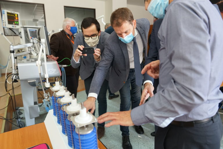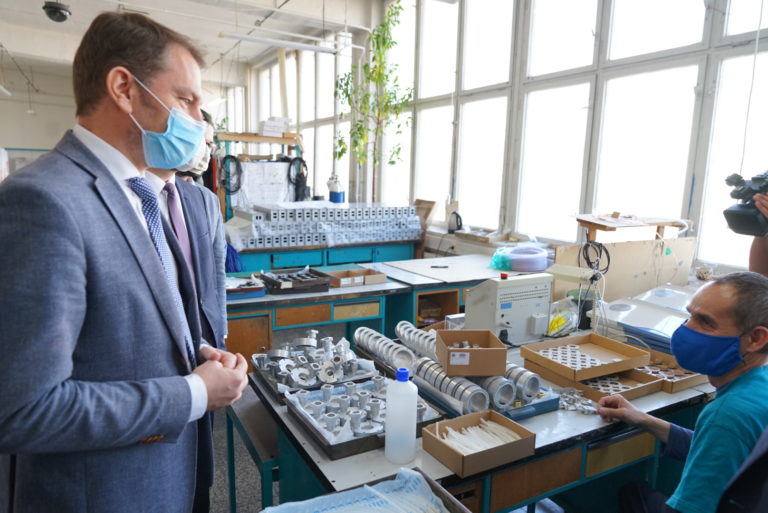 Prehliadka výroby dýchacích prístrojov v areáli spoločnosti Chirana Stará Turá za účasti predsedu vlády SR, ministra zdravotníctva SR a vedenia spoločnosti pri príležitosti symbolického podpisu zmluvy o záväzku vyrábať a dodať 300 pľúcnych ventilátorov do slovenských nemocníc pre ľudí s poškodením pľúc v súvislosti s ochorením COVID-19 spôsobeným koronavírusom (2019-nCoV). Bratislava, 4. apríl 2020. Foto: SITA/Úrad vlády SR