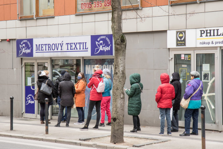 Zákazníci čakajúci v rade pred predajňou metrového textilu po zavedení nových opatrení vlády SR, ktoré umožnili otvoriť ïalšie obchody, služby a prevádzky počas mimoriadnej situácie v súvislosti s ochorením COVID-19 spôsobeným koronavírusom (2019-nCoV). Bratislava, 30. marec 2020.