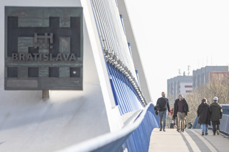 Ľudia prechádzajú mostom Apollo v Bratislave počas mimoriadnej situácie v súvislosti s výskytom ochorenia COVID-19 spôsobeným koronavírusom (2019-nCoV) na Slovensku. Bratislava, 4. marec 2020. Foto: SITA/Branislav Bibel
