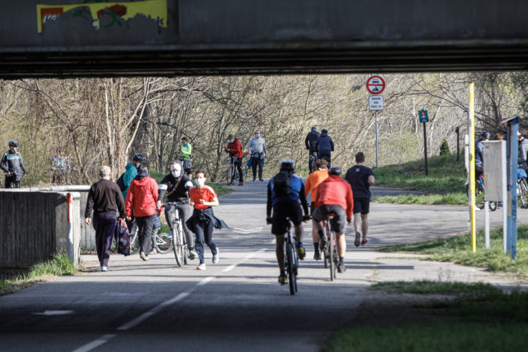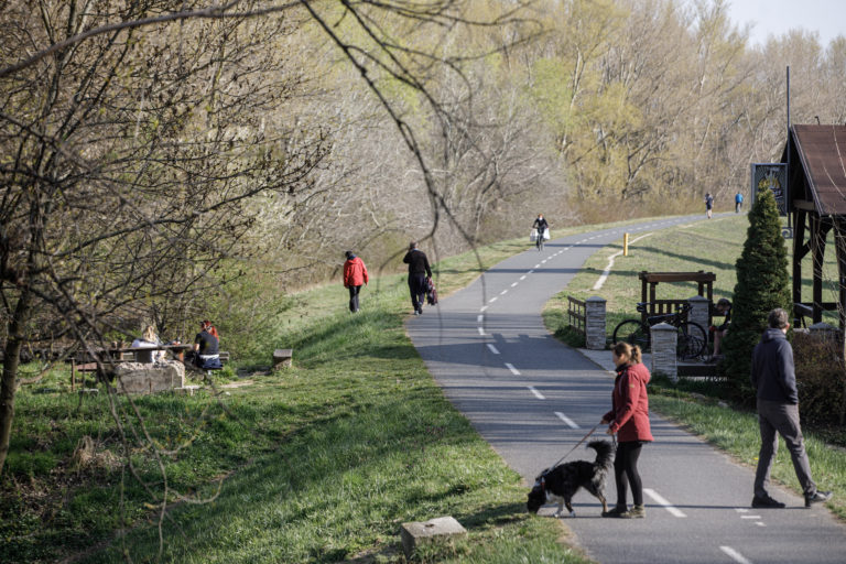 Cyklisti na petržalskej hrádzi v Bratislave počas mimoriadnej situácie v súvislosti s výskytom ochorenia COVID-19 spôsobeným koronavírusom (2019-nCoV) na Slovensku. Bratislava, 4. marec 2020. Foto: SITA/Branislav Bibel