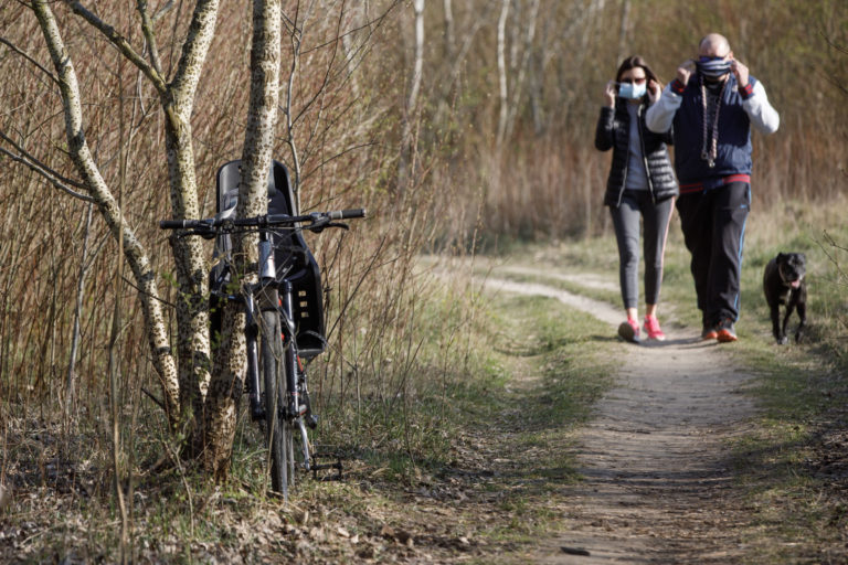 Ľudia na prechádzke so psom v petržalskom Soviom lese, neïaleko rieky Dunaj v Bratislave počas mimoriadnej situácie v súvislosti s výskytom ochorenia COVID-19 spôsobeným koronavírusom (2019-nCoV) na Slovensku. Bratislava, 4. marec 2020. Foto: SITA/Branislav Bibel