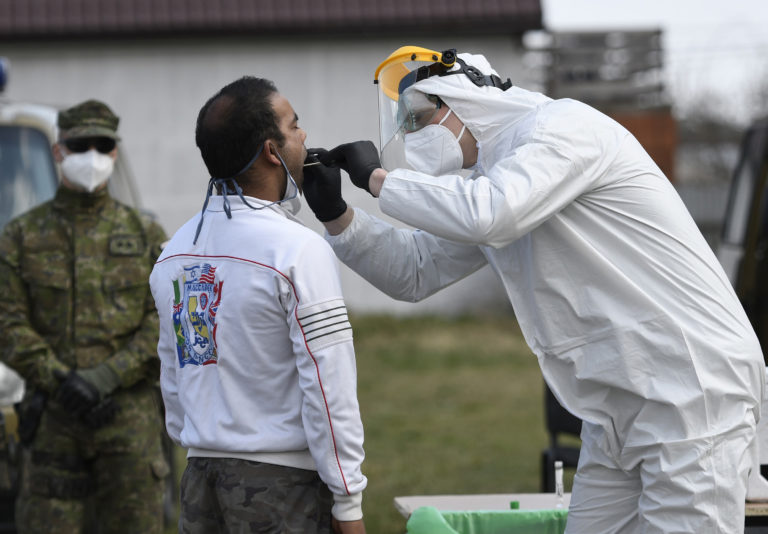 Pacienti čakajú v rade pri kontajneri na testovanie výskytu ochorenia COVID-19 spôsobeného koronavírusom (2019-nCoV) pred Univerzitnou nemocnicou Bratislava Nemocnicou akademika Ladislava Dérera. Bratislava, 20. marec 2020. Foto: SITA/Alexandra Čunderlíková