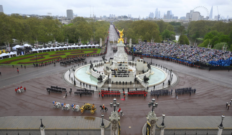 Britský kráľ Karol III. a kráľovná Camilla odchádzajú z Buckinghamského paláca do Westminsterského opátstva pozdĺž The Mall v Londýne. Foto: SITA/AP