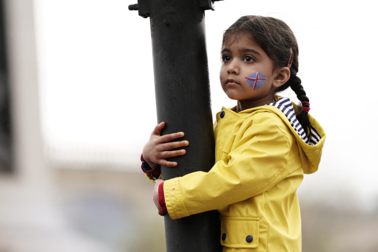 Malé dievčatko sa drží stĺpa lampy, aby malo výhľad na sprievodom kráľa Karola III. Foto: SITA/AP
