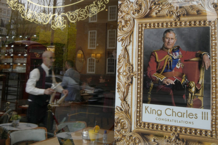 V kaviarni je vystavený obraz britského kráľa Karola III. v Londýne, piatok 28. apríla 2023. Foto: SITA/AP