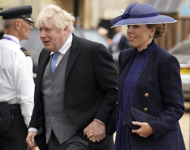 Bývalý premiér Boris Johnson a jeho manželka Carrie prichádzajú do Westminsterského opátstva pred korunováciou kráľa Karola III. a Camilly. Foto: SITA/AP