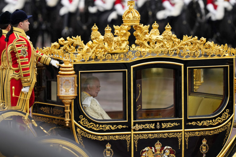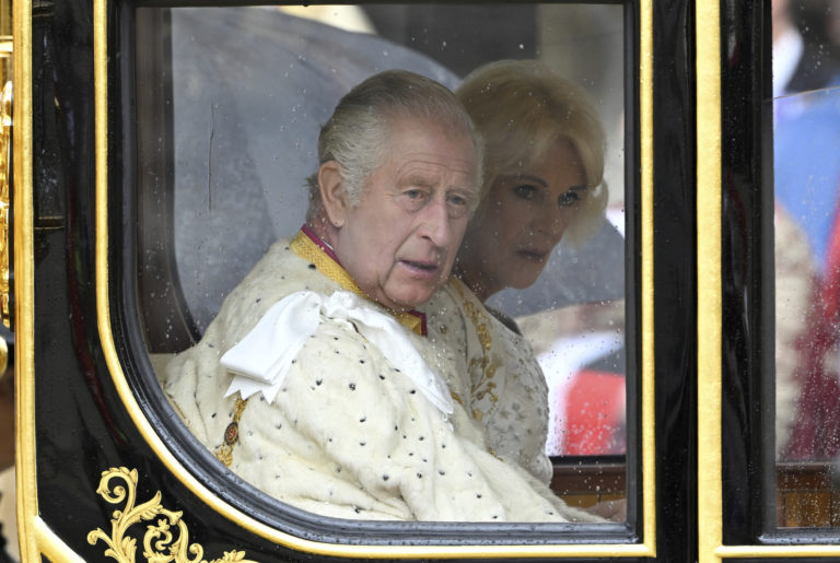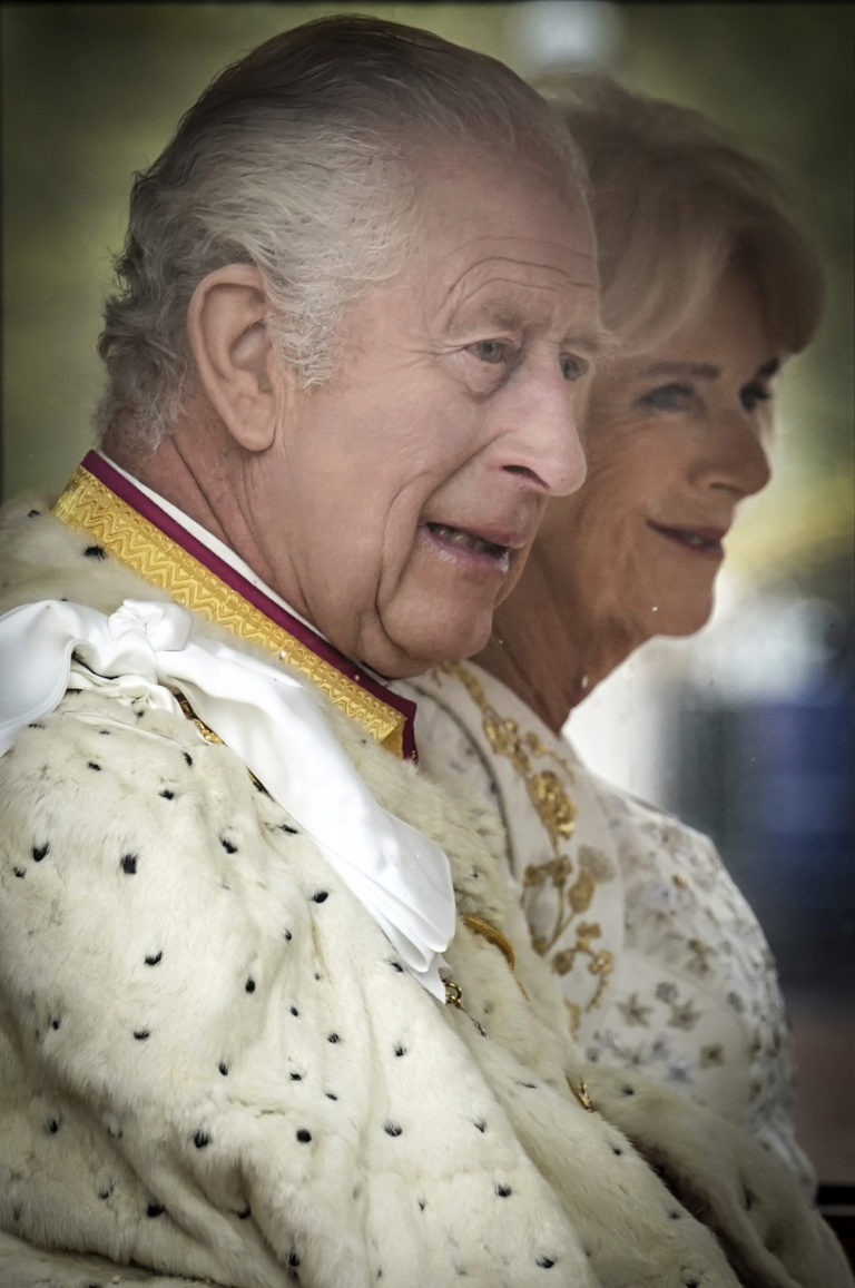 Kráľ Karol III. s manželkou odchádzajú v koči na korunováciu. Foto: SITA/AP