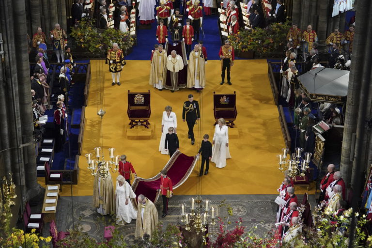 Britský princ George (v strede) stojí vo Westminsterskom opátstve medzi pážatami, aby sa zúčastnil korunovačného ceremoniálu britského kráľa Karola III. a kráľovnej Camilly. Foto: SITA/AP