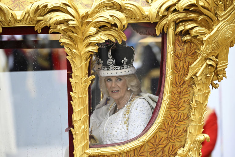 Kráľovná Camilla máva z koča ľuďom sledujúcim sprievod. Foto: SITA/AP