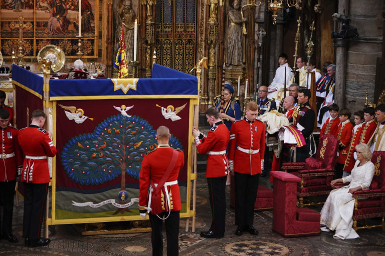 Okolo trónu bola počas pomazania kráľa plenta, ktorá ho zakryla. Foto: SITA/AP
