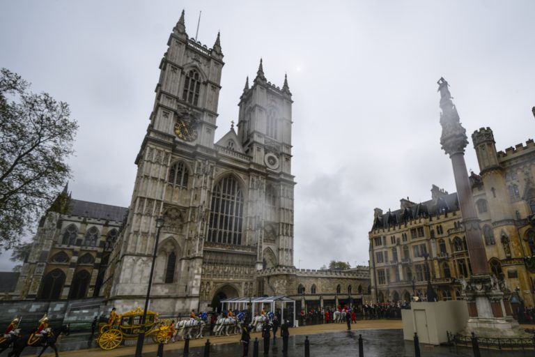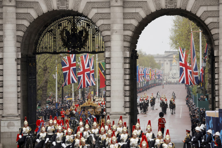 Britský kráľ Karol III. (uprostred) prichádza na svoju korunováciu do Westminsterského opátstva v Londýne, v sobotu 6. mája 2023. Foto: SITA/AP