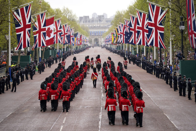 Vojenská jednotka Coldstream Guards pochoduje pozdĺž The Mall pred korunovačnou ceremóniou britského kráľa Karola III. v Londýne, v sobotu 6. mája 2023. Foto: SITA/AP