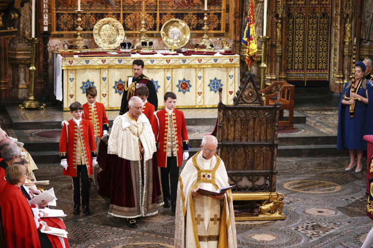 Britský kráľ Karol III. počas korunovačného ceremoniálu vo Westminsterskom opátstve v Londýne, sobota 6. mája 2023. Foto: SITA/AP
